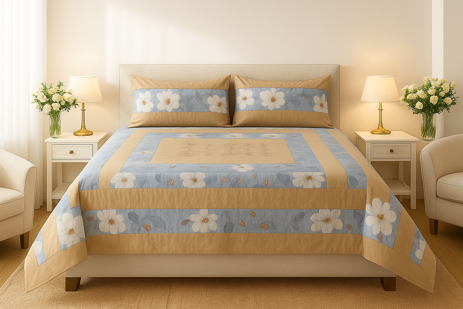 Crafted from 100% pure cotton patchwork, this design blends buttery beige and pastel blue florals, creating a warm, Pinterest-perfect vibe that makes your space feel fresh, calm, and full of sunshine.